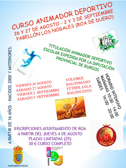 Se celebrará durante los días 26-27 de agosto y 2-3 de septiembre en el Pabellón "Los Nogales" (Roa de Duero). El curso está abierto a personas de 16 años en adelante (nacidos en el año 2000 y anteriores). Los deportes a trabajar serán los siguientes: