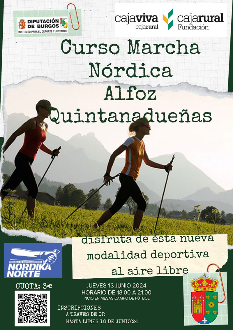 El IDJ de Diputación de Burgos y Fundación Caja Rural organizan un curso de marcha nórdica en Quintanadueñas el próximo jueves 13 de junio de 18.00 a 21.00 h. Habrá una primera parte teórico-práctica y una posterior salida por la zona para practicar esta modalidad deportiva.