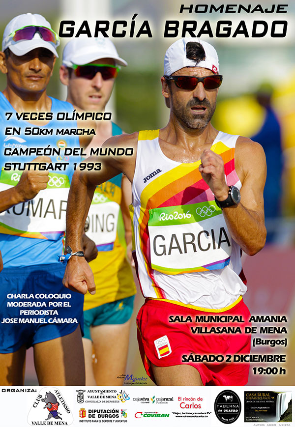 Jesús Ángel García Bragado, campeón del mundo en 50 km. marcha en 1993 y único atleta del planeta que ha disputado 7 Juegos Olímpicos, recibirá un homenaje en la Sala Municipal Amania, de Villasana de Mena (Burgos) el próximo sábado 2 de Diciembre, a las 7 de la tarde. El acto se enmarca dentro de la Semana Cultural que organiza el Ayuntamiento del Valle de Mena.