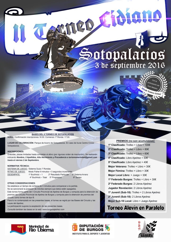 El sábado 3 de septiembre se celebra la última prueba del Circuito de Ajedrez. Sotopalacios alberga el II Torneo Cidiano con 400 euros en premios más los premios habituales (trofeos, libros, regalos de ajedrez...), a lo que hay que añadir algunos premios especiales Cidianos. Además, hay otro Torneo paralelo de categoría alevín, idóneo para los más pequeños.