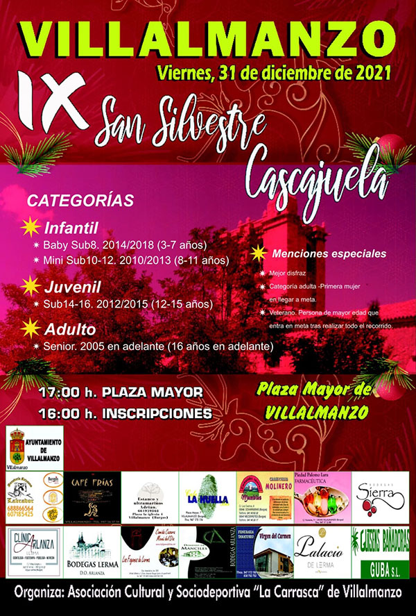 La localidad de Villalmanzo acogerá su tradicional San Silvestre Cascajuela, organizada por la Asociación Cultural y Sociodeportiva "La Carrasca", el próximo viernes 31 de diciembre a las 17:00 h. Con el objetivo de que pueda participar todo el mundo, se han establecido las siguientes categorías: