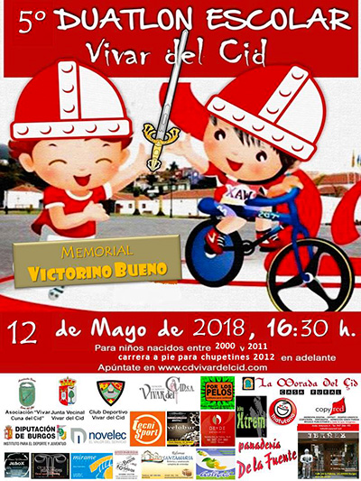 El próximo 12 de mayo a las 16:30 h. se celebrará el 5º Duatlón Escolar de Vivar del Cid (Burgos), dirigido a niños y niñas de la provincia nacidos entre 2.000 y 2.011, con pruebas de Pre-benjamines y Chupetines nacidos de 2012 en adelante.