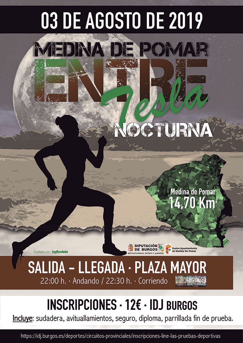 El Instituto Provincial para el Deporte y Juventud de la Diputación de Burgos y el Ayuntamiento de Medina de Pomar, en colaboración con el Club Entre-Tesla, Medina Runing y 4X4 Merindades, organizan, el día 3 de Agosto a partir de las 22,00 horas, la VII Travesía Nocturna Entre-Tesla.
