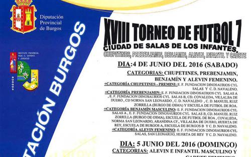 El Instituto Provincial para el Deporte y Juventud, el Ayuntamiento de Salas de los Infantes junto con la colaboración de la Delegación Provincial de Fútbol de Burgos y el C. P. Salas organizan el XVIII Torneo de Fútbol 7 “Ciudad de Salas de los Infantes” los días 4 y 5 de Junio, en el cual van a participar 52 equipos de la provincias de Burgos y Soria.