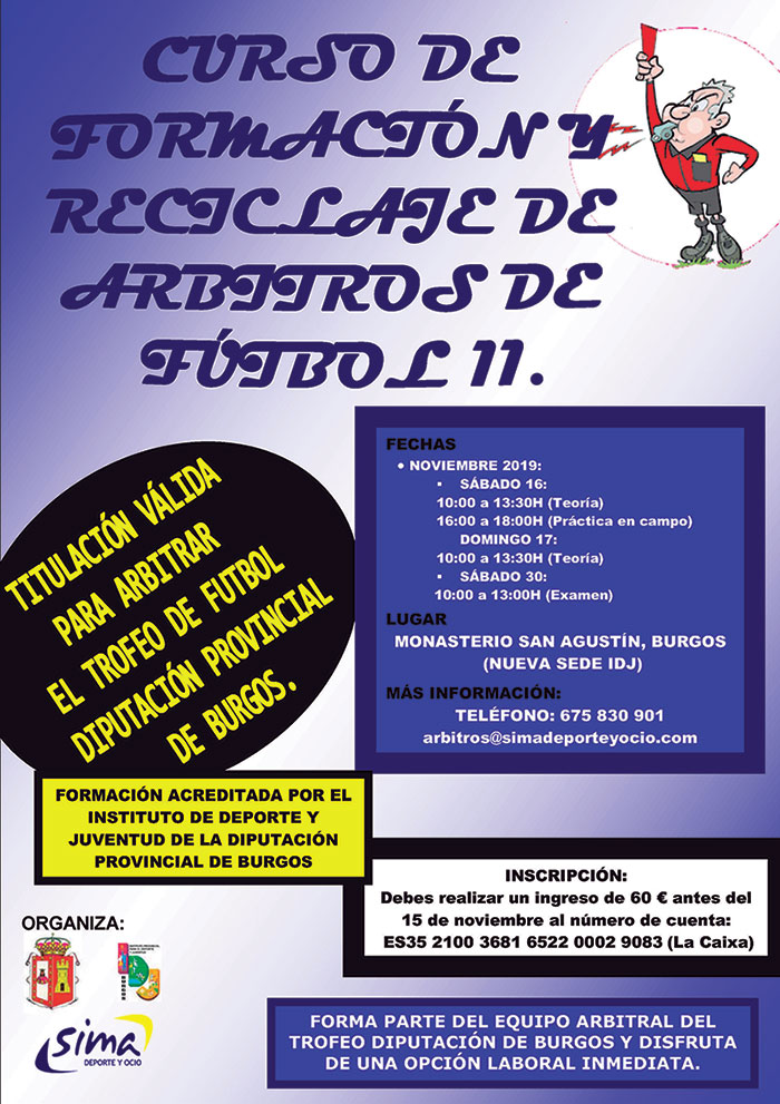 El Instituto Provincial para el Deporte y Juventud junto a la empresa SIMA Deporte y Ocio, organizan un Curso de formación y reciclaje de árbitros de fútbol 11, que se celebrará los días 16, 17 y 30 de noviembre. El objetivo del curso es que los alumnos obtengan la titulación válida para arbitrar el Trofeo de Fútbol "Diputación de Burgos".