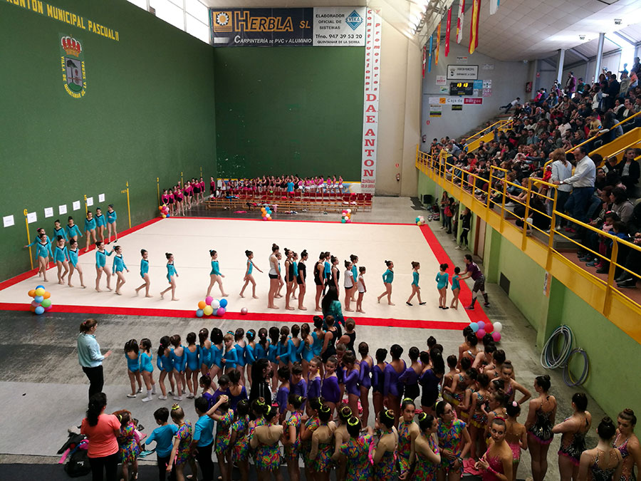 Las 200 gimnastas de Salas, Melgar, Briviesca, Roa de Duero, Belorado, Aranda de Duero, Lerma, Quintanar de la Sierra y del Club Gimnasia Burgos expusieron sobre el tapiz el trabajo preparado durante el curso 2017/18 e hicieron disfrutar a un público que abarrotó el Frontón Municipal.