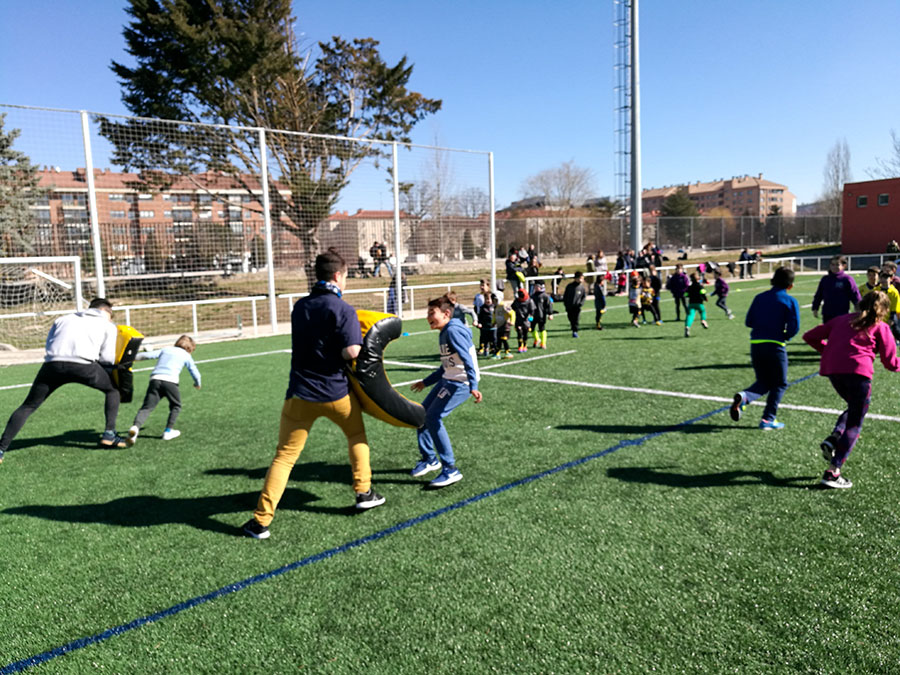 El inicio de la jornada fue la presentación de la misma en el centro de las instalaciones por parte de los organizadores a todos los presentes. Seguidamente se distribuyeron los grupos acordes a la edad. Los entrenadores y monitores del Club Aparejadores de Burgos de Rugby instruían y daban indicaciones a los escolares en el manejo del balón y tipo de pase, combinados con juegos con el oval que completaron la mañana lúdico-técnica.