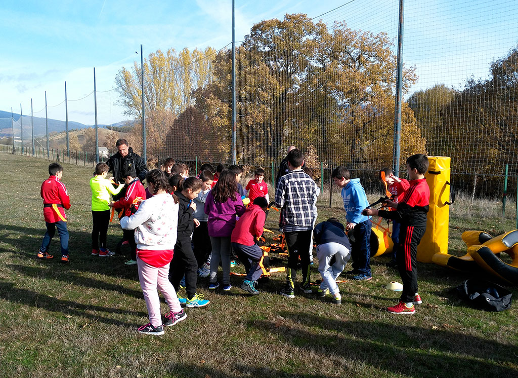 Los entrenadores del Club Aparejadores de Burgos de Rugby instruían y daban indicaciones a los escolares en el manejo del balón y tipo de pase, combinados con juegos con el oval que completaron la mañana lúdico- técnica. La jornada consistió en un circuito de ejercicios de iniciación: pase, patada, placaje, coordinación y finalizando con juegos de rugby cinta por categorías.